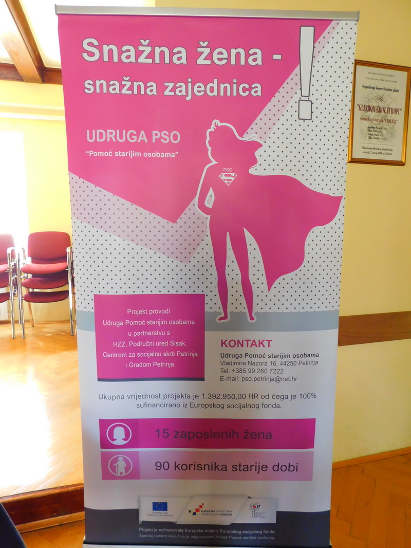 „Projekt će omogućiti usvajanje novih znanja i vještina za 15 dugotrajno nezaposlenih žena na području grada Petrinje i okolice, s ciljem povećanja njihove zapošljivosti, kroz pružanje socijalnih usluga za 90 krajnjih korisnika, možda i kojeg više. Projektne aktivnosti su usmjerene na podizanje kvalitete života starijih osoba i njihovo što duže zadržavanje u vlastitom domu. Ukupna vrijednost projekta je  1.392.950,00 kn i 100 posto je sufinanciran iz Europskog socijalnog fonda kroz Operativni program „Učinkoviti ljudski potencijali 2014. – 2020.“.  Svrha projekta je uključiti žene iz Petrinje i okolnih sela koje pripadaju teže zapošljivim i ranjivim skupinama na tržište rada s ciljem smanjenja siromaštva i nezaposlenosti, a koje će svojim radom doprinijeti kvalitetnijem životu krajnjih korisnika odnosno osoba starije životne dobi koje su u potrebi za pomoći, a za koje naša udruga skrbi već dugi niz godina. Nadamo se da će projekt biti uspješan i da će zaživjeti i kasnije, dakle i nakon ovih godinu dana koliko će trajati“.